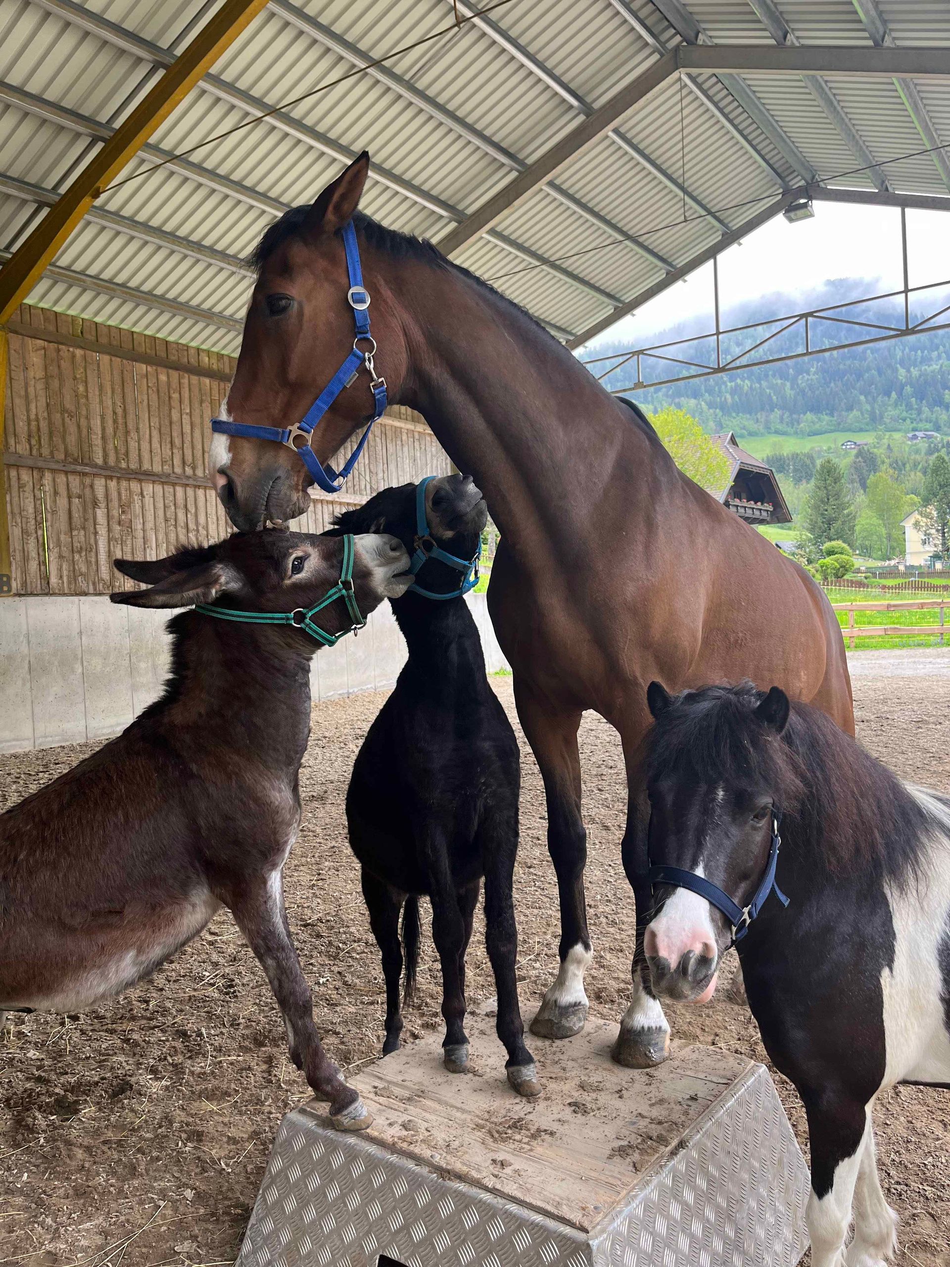 Die an zwei Seiten offen gehaltene Reithalle mit angrenzender Weide von etwa drei Hektar Fläche bietet 375 Quadratmeter überdachte Fläche. Diese kann als Allwetterplatz, Reithalle oder auch als Lager für Hackschnitzel genutzt werden. Zusätzlich steht ein Carport mit Platz für vier Fahrzeuge sowie für Traktor und Anhänger zur Verfügung.
