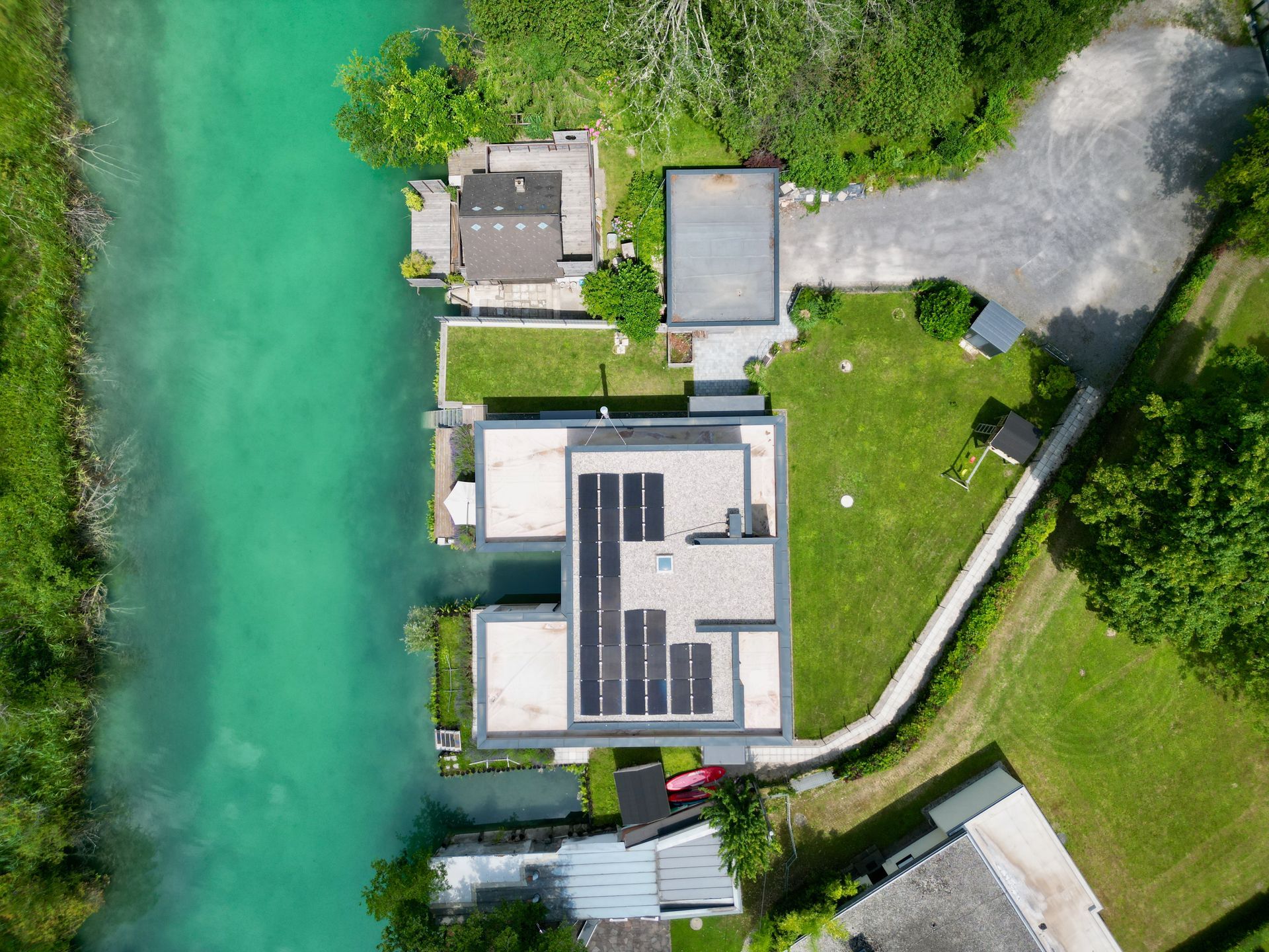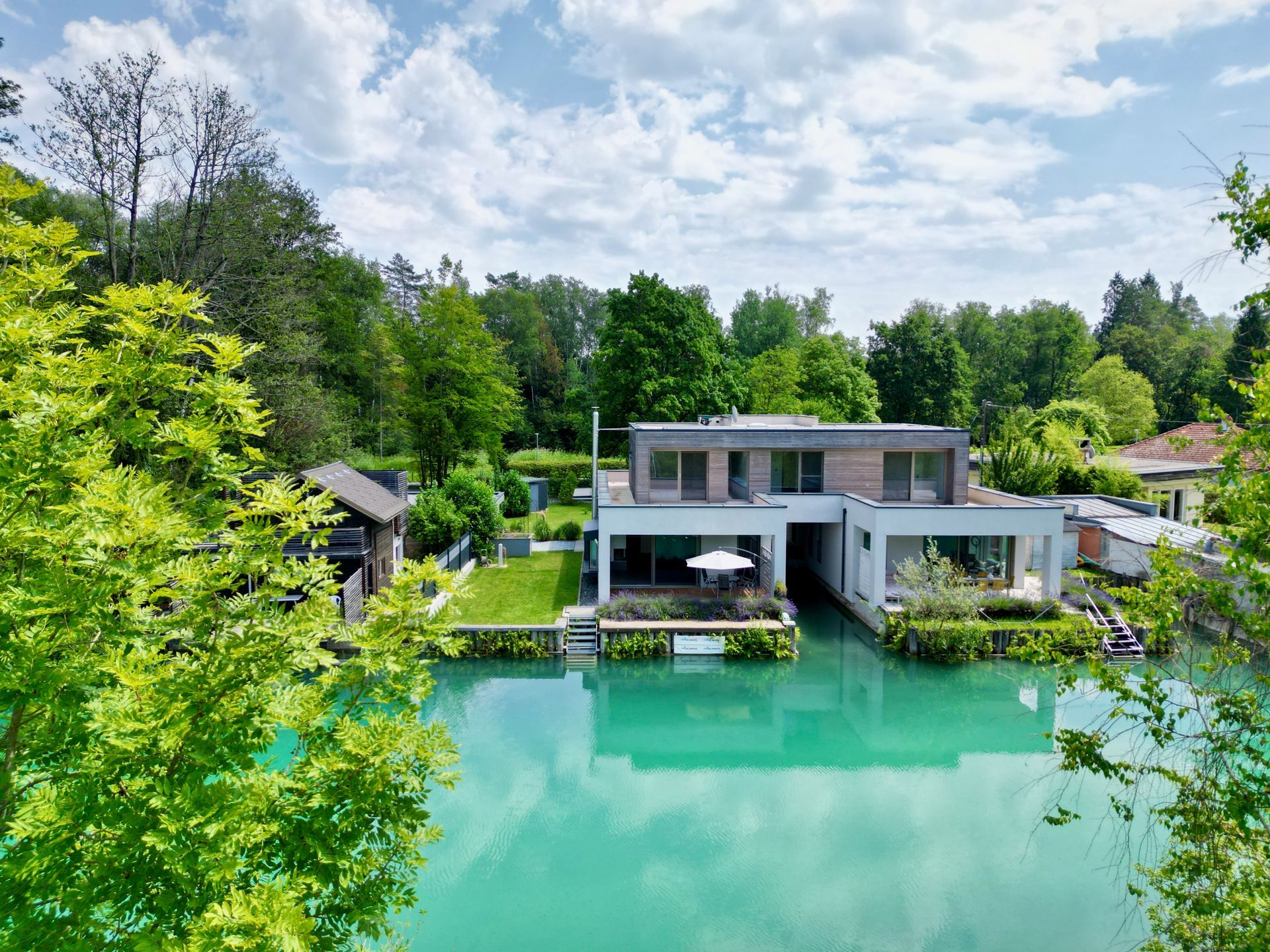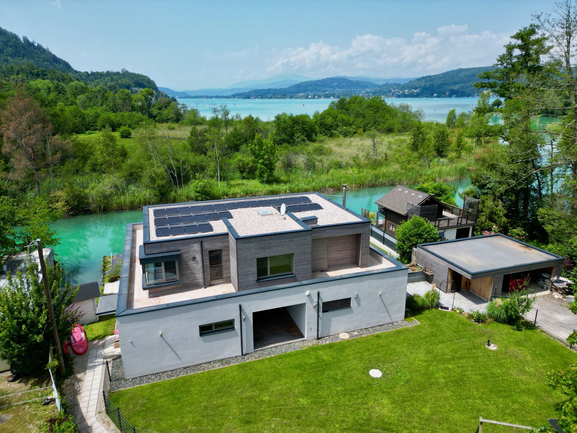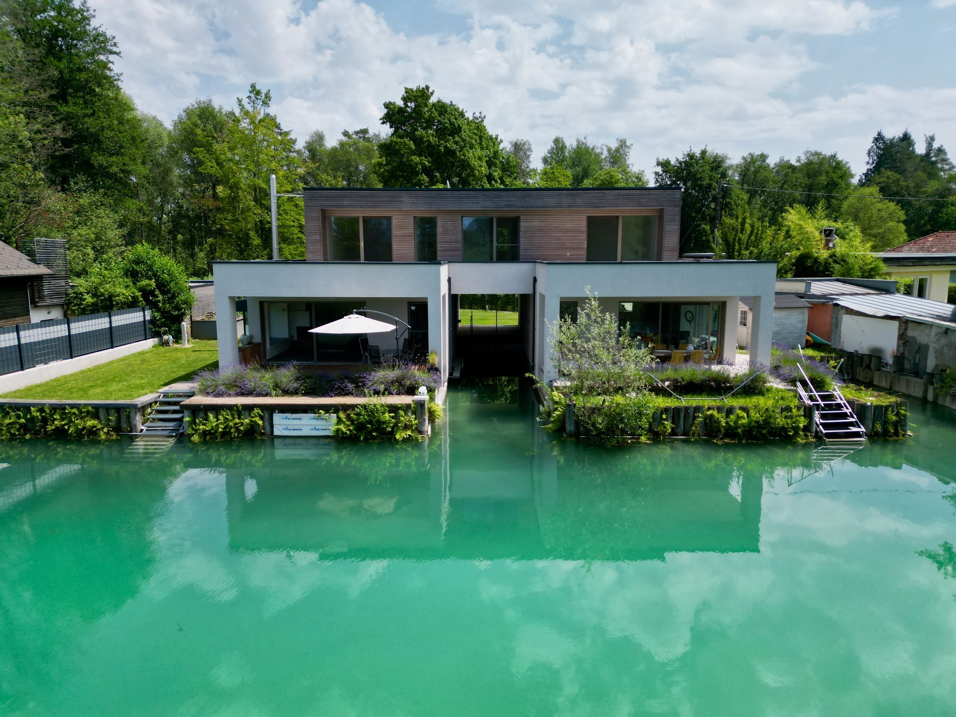 Am Seespitz in der Klagenfurter Ostbucht des Wörthersees erwartet Sie diese einzigartige Immobilie. Das Gebäude wurde vor 5 Jahren errichtet und gliedert sich in eine Wohneinheit mit 177 Quadratmetern und eine Einliegerwohnung mit 84 Quadratmetern. Neben 4 KFZ Abstellplätzen im Freien und einem Carport für 2 Fahrzeuge gibt es einen überdachten und einen nicht überdachten Bootsliegeplatz. Von den westseitigen Terrassen gelangt man direkt in das türkise Wasser des Wörthersees, der in diesem Bereich als Natura 2000 Schutzgebiet gewidmet ist.
