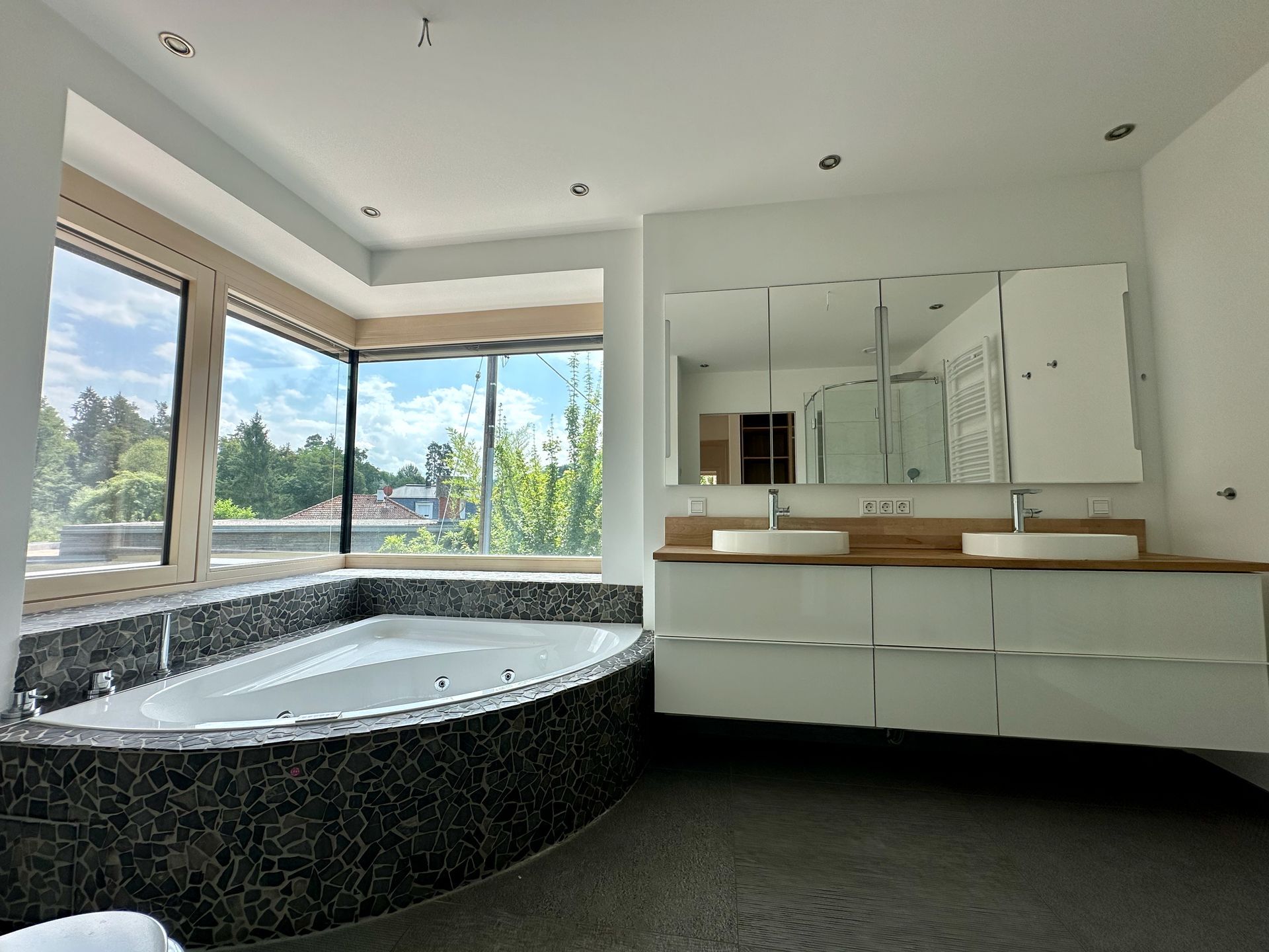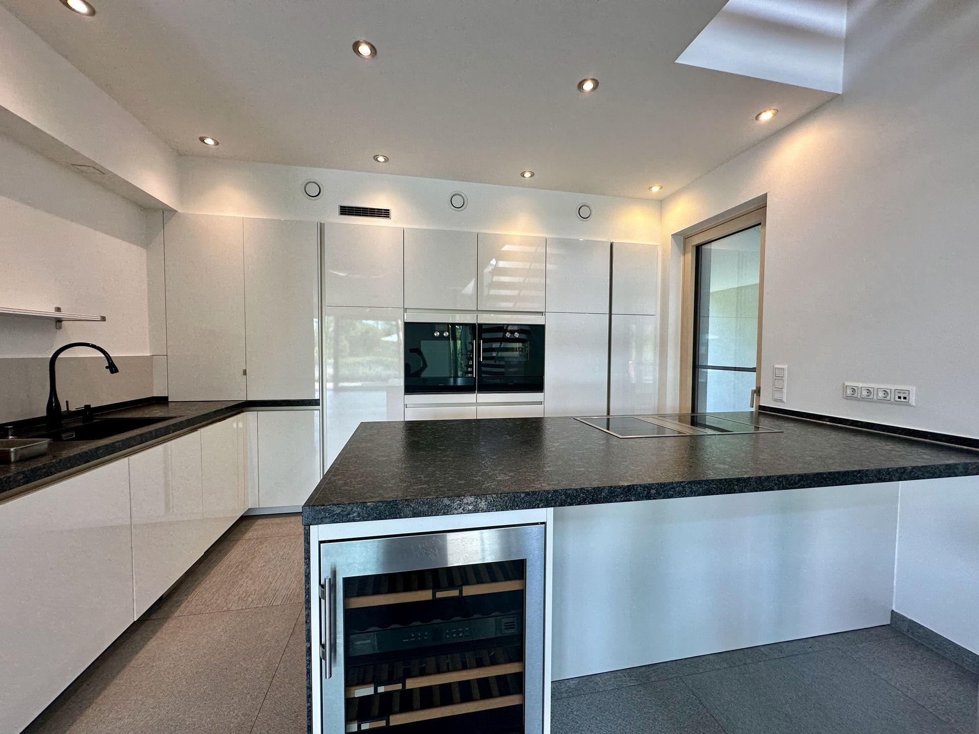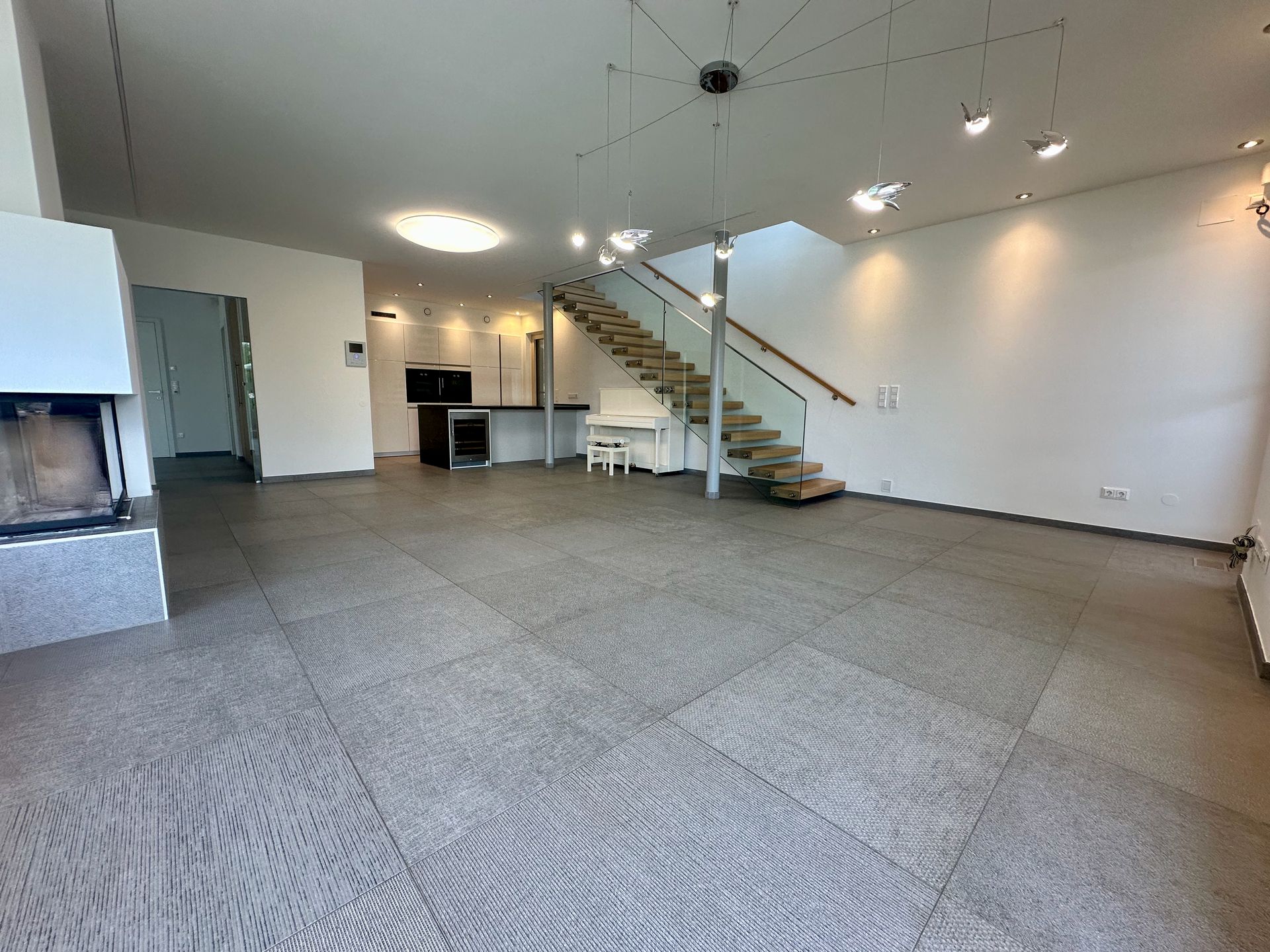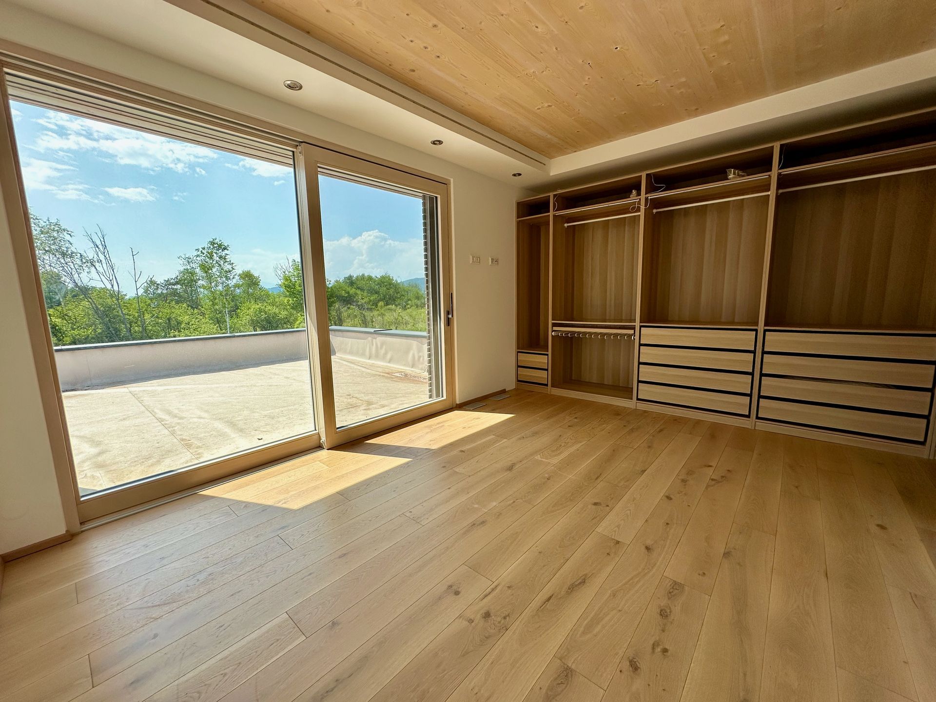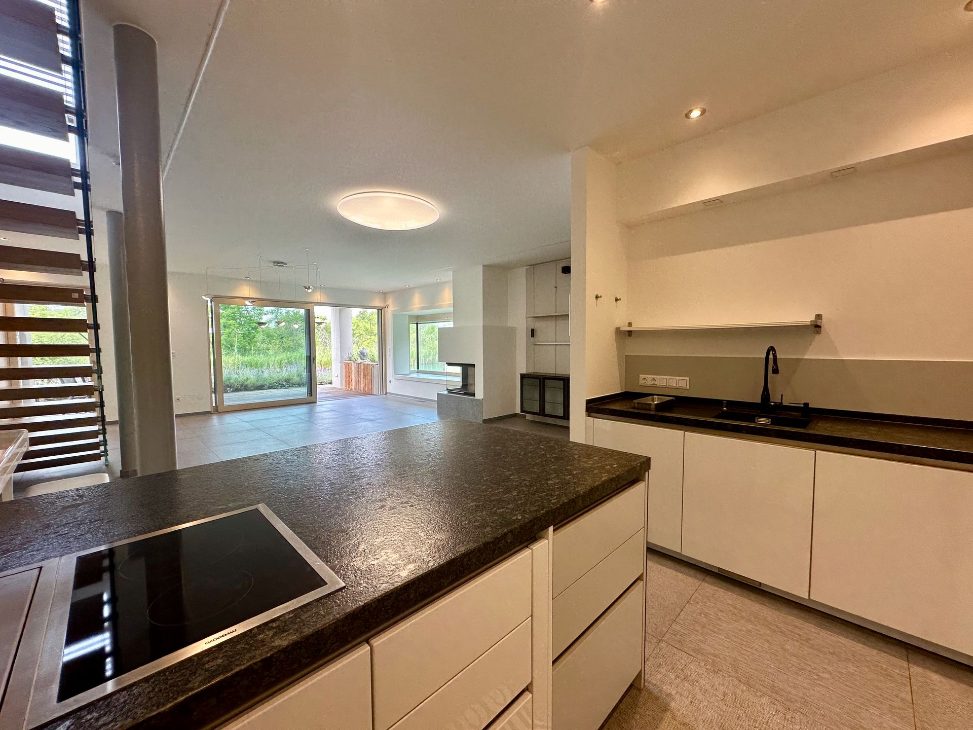Die große Wohneinheit ist im Erdgeschoß als offener Wohn-Essbereich mit einer Einbauküche von Siematic und Gaggenau Küchengeräten ausgestattet. Ein Kamin und eine Sitznische am Fenster laden auch in der kühlen Jahreszeit zum gemütlichen Verweilen mit Blick auf das Wasser ein. Im Obergeschoß können 4 Zimmer mit Zugang zur Dachterrasse genutzt werden. Der Master Bedroom ist mit einem eigenen Badezimmer mit WC, Dusche und Eckbadewanne, sowie Ankleidebereich verbunden. Zusätzlich steht den anderen Räumen ein Gästebad mit WC zur Verfügung.